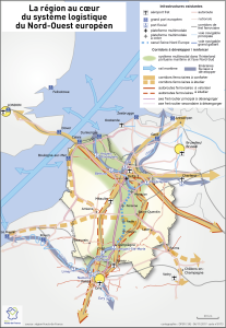 L’Axe Nord est donc au cœur des grands flux de marchandises en Europe avec une proximité immédiate des grandes capitales et des 4 pôles économiques et démographiques majeurs : Londres, Paris, la Randstad néerlandaise et la Ruhr). Il est doté de grandes infrastructures fluviales, ferroviaires (1er pôle ferroviaire de France) et aéroportuaires.