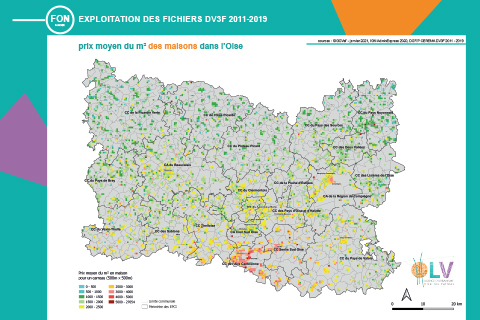 En début d’année 2021, l’exploitation du fichier DV3F (plus détaillé) permet à l’Agence de restituer sous forme de cartes le prix moyen du bâti, des maisons, des appartements et des terrains observé dans le département de l’Oise.